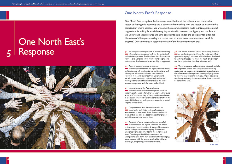 Each chapter title-page builds a little more of the puzzle until, by the final chapter, the completed image is revealed. The key theme for the brochure design was the use of the jigsaw puzzle framing-device which to convey how different voluntary and community organisations fit together to form a cohesive whole.