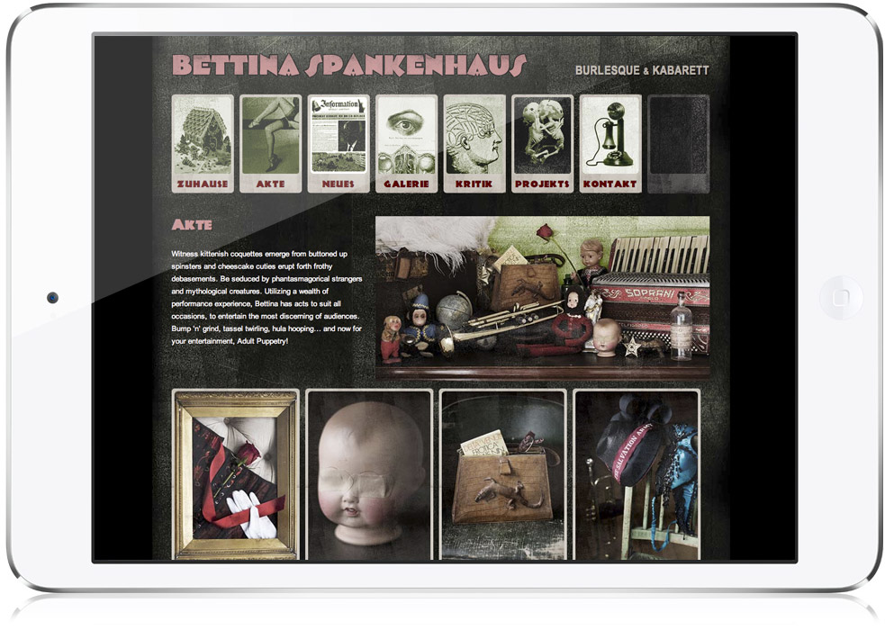 Burlesque and cabaret artiste Bettina Spankenhaus commissioned Velcrobelly to create this unique website design. An online absinthe-soaked nightmare the website reflects her on-stage persona. A showcase for her unique theatrical characters and burlesque performances.
