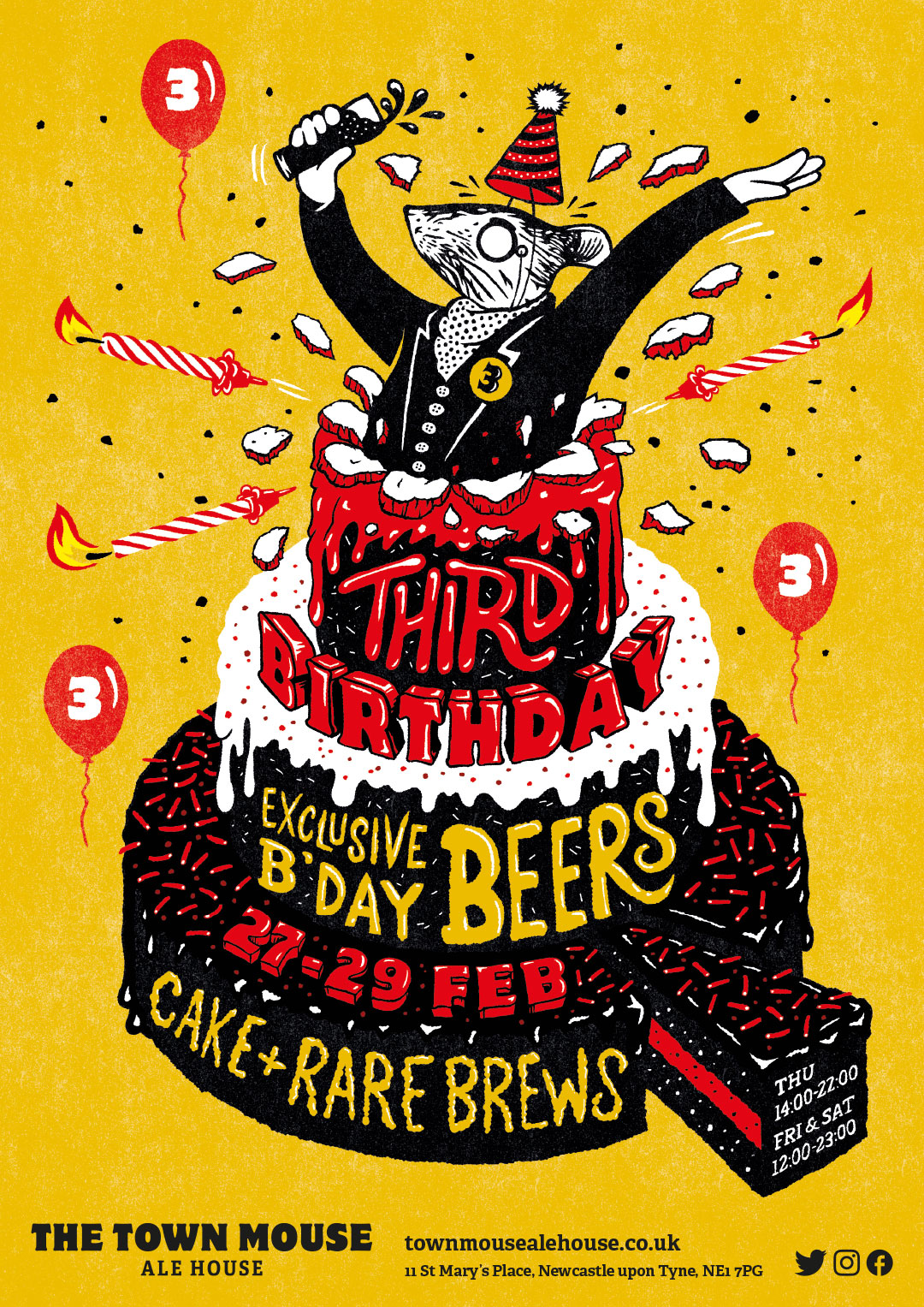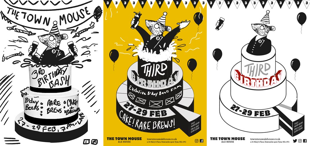 An illustrated poster design for The Town Mouse Ale House’s third birthday celebration event.